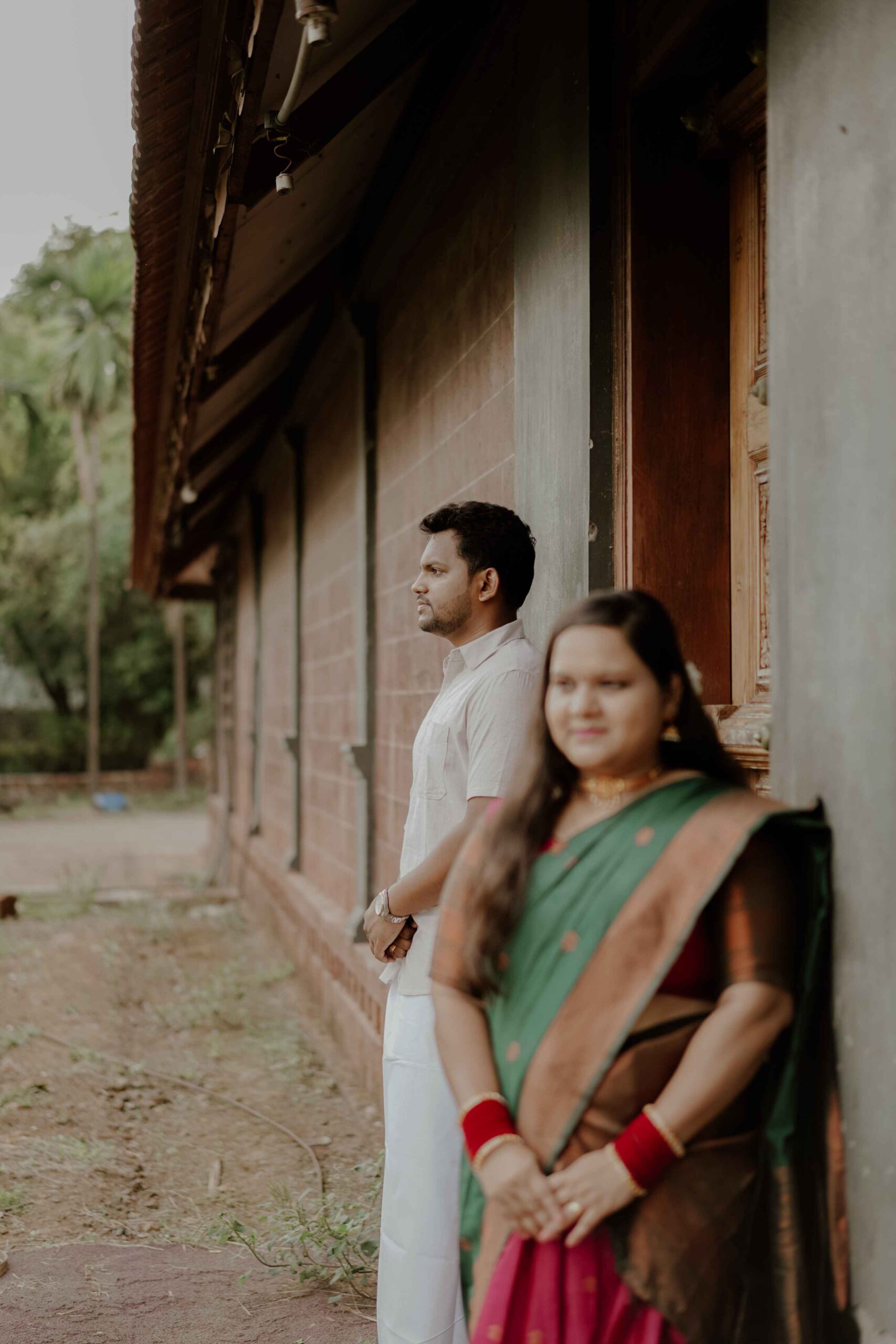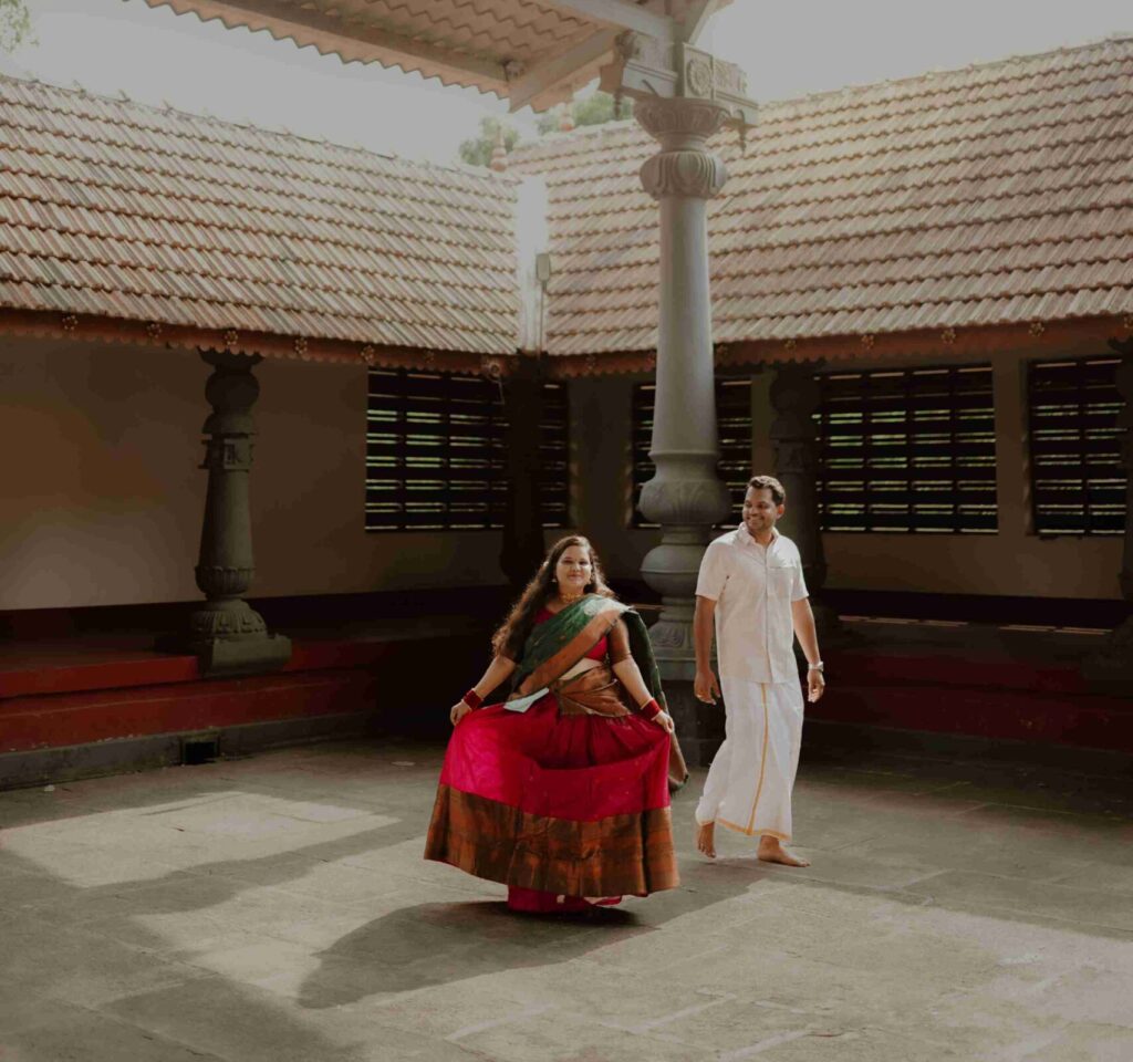 Set in a classic Kerala-style courtyard with tiled roofs and heritage pillars, this shoot focused on authenticity. Instead of dramatic posing, the concept was to embrace natural movement — Radha gracefully walking in her traditional attire while Sham followed with admiration and warmth.
